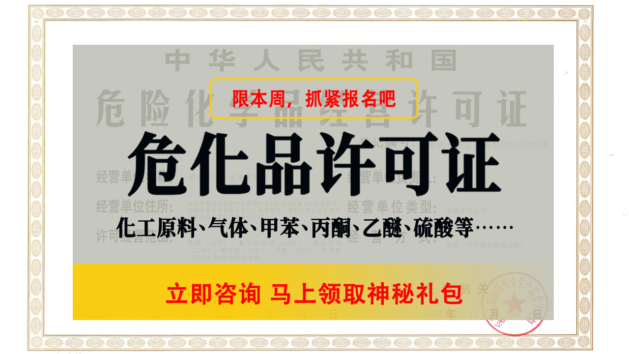 危險化學(xué)品無論是在日常生活還是相關(guān)的行業(yè)當中,都有著不可替代的位置,因此導(dǎo)致很多人都想要經(jīng)營危險化學(xué)品。但是想要經(jīng)營危險化學(xué)品首先需要獲得危險化學(xué)品經(jīng)營許可證,那么,在東莞危險化學(xué)品經(jīng)營許可證在哪里辦呢?又是如何辦理的呢?下面匯域國際小編就來為您詳細介紹:
